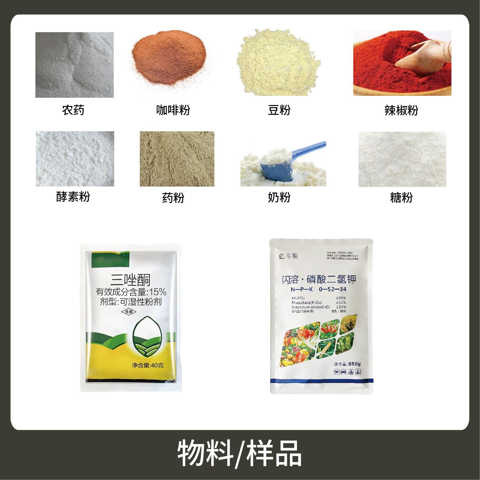 適用于食品、醫(yī)藥、化工、化妝品行業(yè)中粉劑等大克重物品的計量包裝,如:面粉、玉米粉、農(nóng)藥粉等。